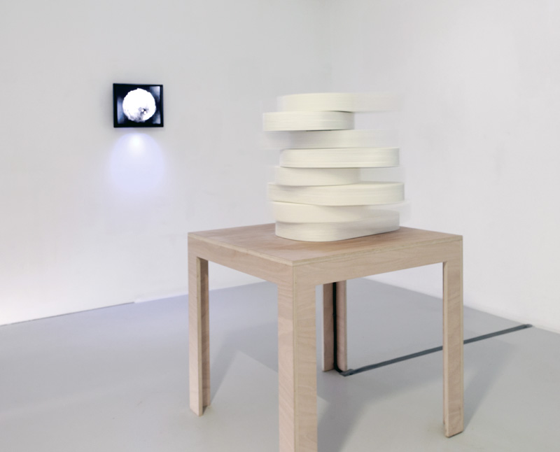 Construction rotative constituée de capsules empilées qui tournent indépendamment les unes des autres, cette sculpture évoque les