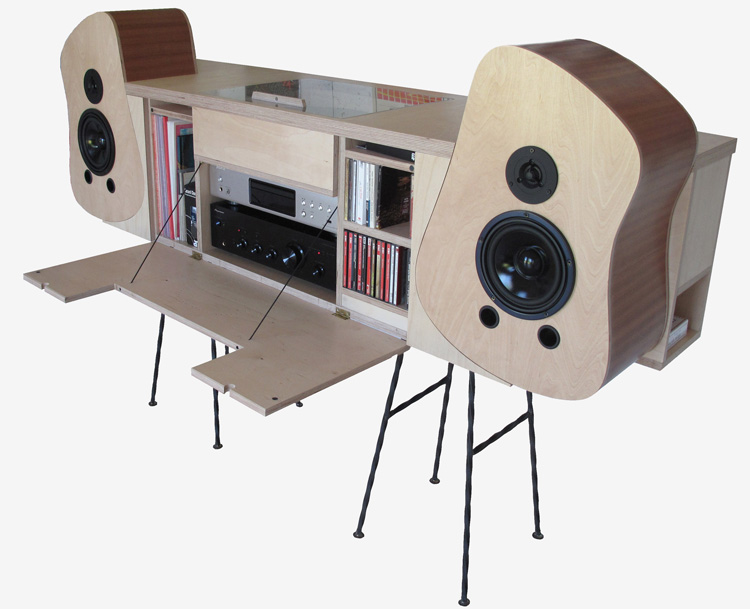 Contreplaqué de bouleau verni, placage en sapelli verni, piétements en métal torsadé, capot de la platine tourne disque en Altuglass transparent.