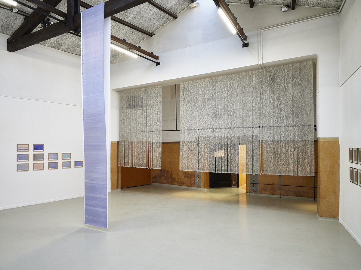 Suspendues en 73 bandes à l’entrée de l’espace, numérotées selon la classification d’un répertoire inhérent aux opus, l’empreinte du sol est hissée à la verticale, le sol diésé par cette bascule de 90 degrés devient une peau spectrale, telle une mue, dont l’exuvie fait apparaître son double incertain.