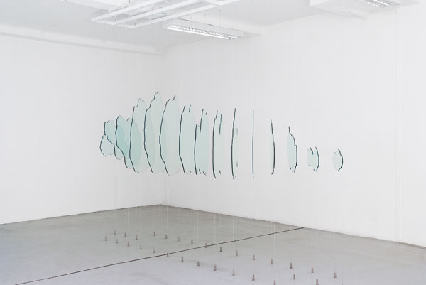 Verre, câbles, structure métallique, 405 x 165 cm (hauteur du nuage:114 cm)