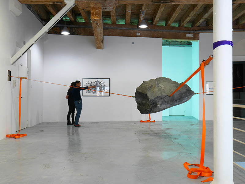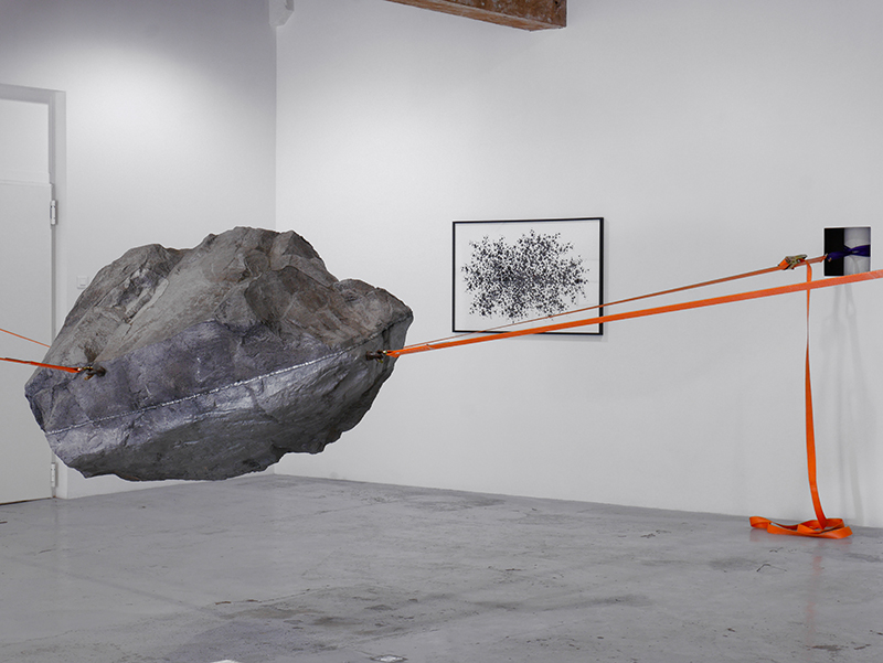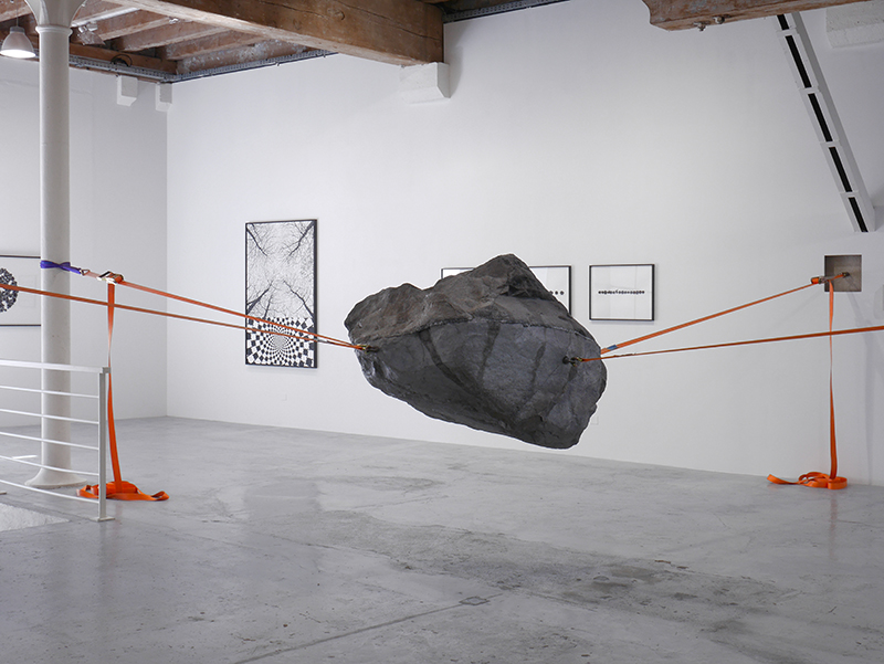Car juste à côté c’est une “étoile filante”, une météorite de fonte massive, venue évidemment du fin fond de l’univers qui atterrit dans la galerie. Des sangles solidement accrochées ont réussi à stopper sa chute, qui aurait immanquablement creusé sous nos pieds un cratère immense, transformant le Panier en trou béant … La plus grande météorite du monde, à Hoba, est aussi le plus gros morceau de fer existant : 60 tonnes, record Guiness tombé du ciel, celle de Cape York que l’on peut toucher au Musée d’Histoire Naturelle de New York, n’en pèse que la moitié, mais quelle émotion sous la main que de tâter la fraîcheur imaginaire de l’espace intersidéral… Celle de l’exposition est en fonte d’aluminium, plus petite et moins lourde mais suffisamment pour exiger de la galerie qui l’expose une carrure particulière, une résistance que l’on perçoit dans la tension maximum des sangles qui la soutiennent, d’une immobilité absolue et le cerveau perçoit “en creux”, pour ainsi dire, l’énorme force de la gravité contrariée. Car on se trouve là, dans cet entre-deux, dans cet équilibre instable, celui qui est sensé ne durer qu’une fraction de seconde et qui ici s’éternise. La mouvance de l’univers se trouve là, entre ces murs, arrêtée dans sa course, suspendue dans le temps.