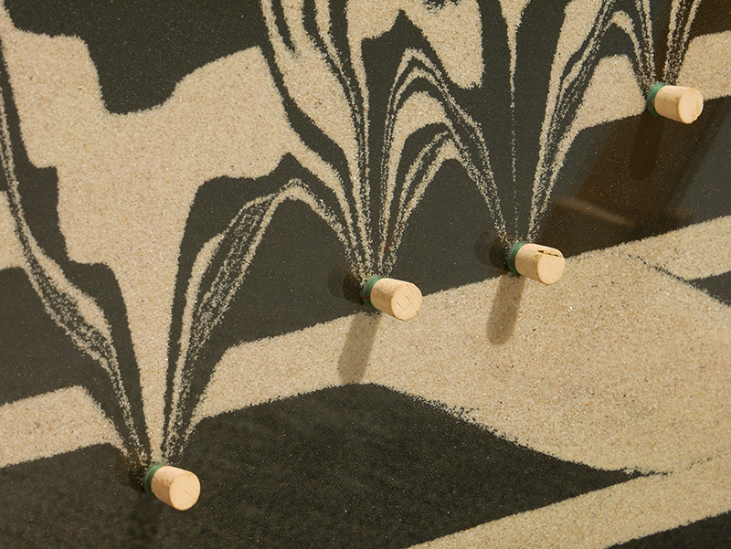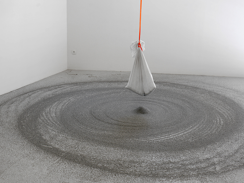 Pour donner à voir, Pierre Malphettes se livre ici à des expérimentations, dans la galerie même, met au point des process venus d’intuitions pas toujours évidentes : qui aurait cru qu’un sac de sable percé d’un trou et lancé à telle vitesse dessinerait au sol une galaxie spiralée ? Changez le diamètre du trou et la vitesse du lancer et vous récoltez plutôt le chaos. Cette pièce immobile exprime pourtant le mouvement qui l’a créée, que l’esprit reconstitue et comprend. Un expérimentateur scientifique aurait-il procédé autrement ?
