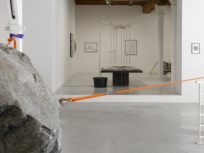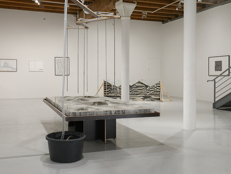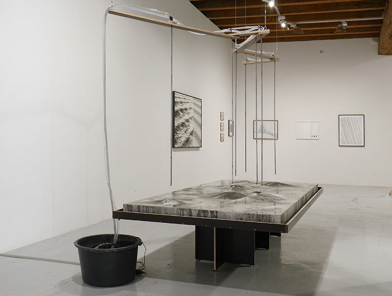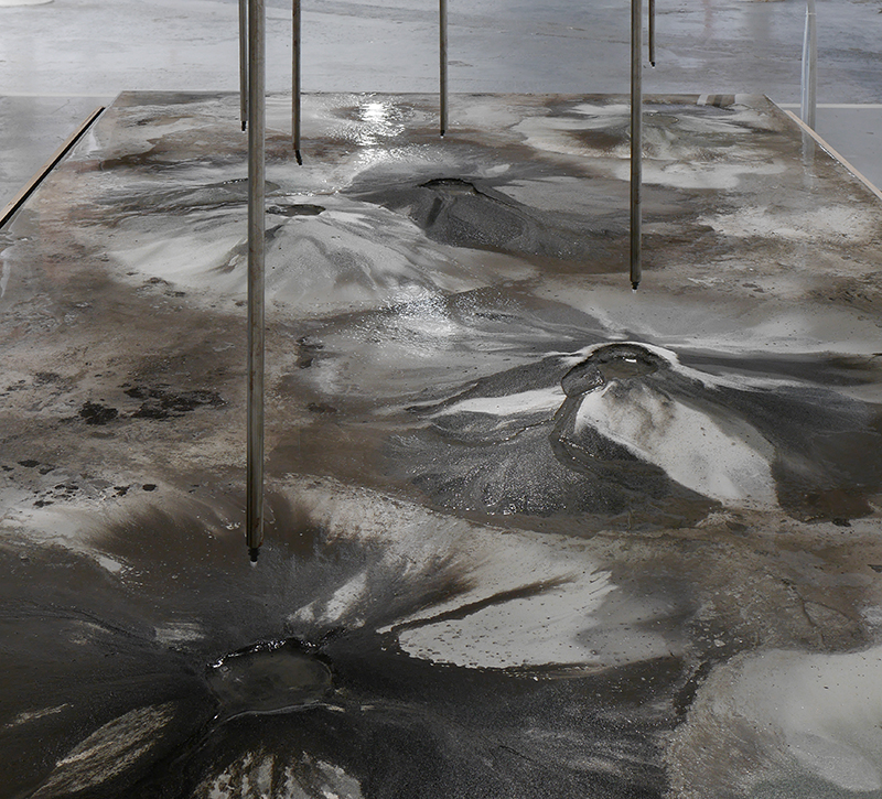 Poussières de marbre, eau, pompe à eau, acier, bois, géotextile, bassine, dimensions variables, plateau : 300 x 150 x 65 cm