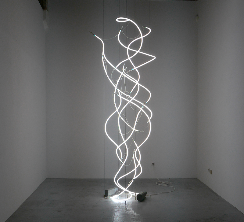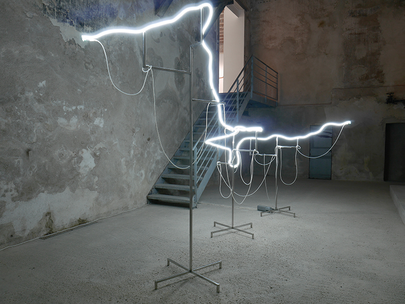 Néon blanc, Inox, câbles éléctriques, transformateur électrique, 450 x 150 x 250 cm |