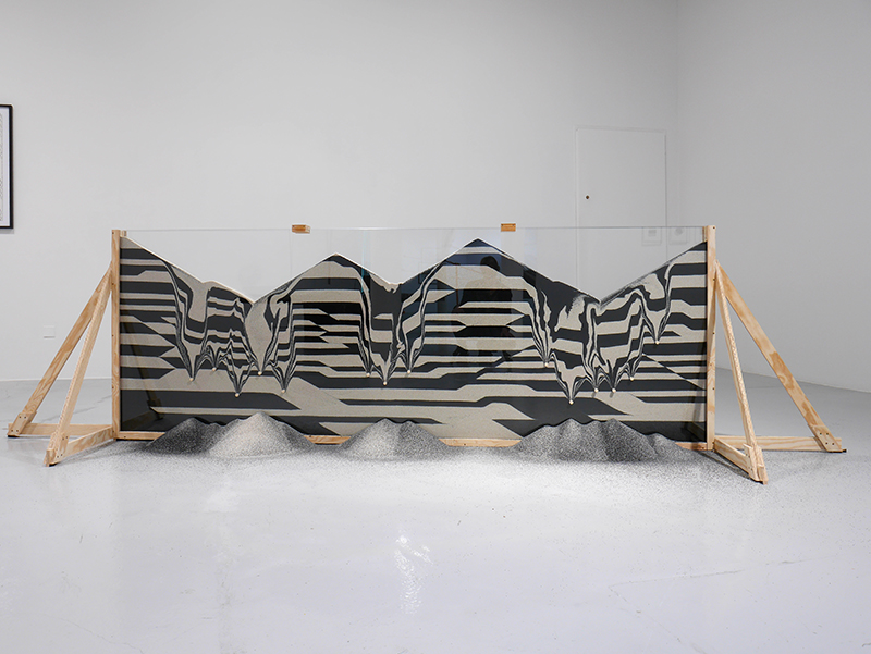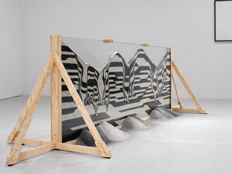 Ailleurs, des percements effectués dans le verre retenant des stratifications de sables colorés où Pierre Malphettes avait réussi à faire cohabiter matière naturelle granuleuse et patterns “hard edge” créent des effondrements souterrains, des cônes d’éboulements, la skyline d’une chaîne de montagne lambda dont apparaissent les dessous en couches alternées. Une coupe dans la matière qui rappelle, certes, dans son principe, les artefacts en bouteille des artisanats, mais évoque surtout les coupes géographiques et géologiques de la terre, illustrant ce que l’on sait du monde en train de se faire, quand les carrotages du sous-sol nous en révèlent la matérialité, mais aussi l’histoire dans les matières qu’ils remontent, venues du fond des temps et encore parfois porteuses de vie.