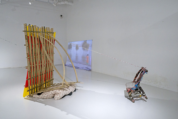 Dessin mural, vidéo 2'48 en boucle, gonflables, couvertures, palissades, chaises