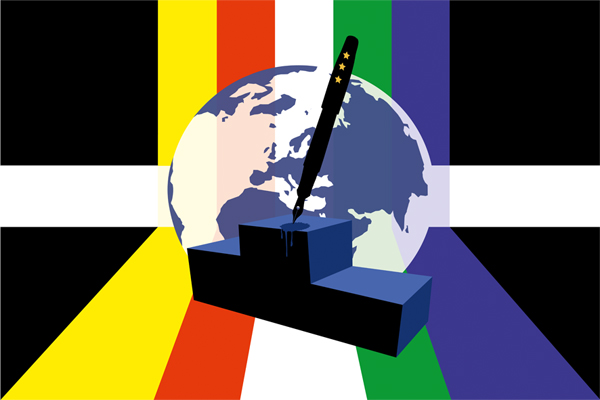 Passant du mot à l’image, les différentes étapes de recherches ont donné lieu à une réalisation monumentale. L’image d’un emblème est matérialisée par l’assemblage d’objets à facettes colorées sur le modèle des photographies militaires du début du XXème mettant en scène des troupes de soldats.