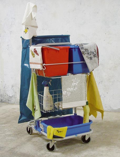 Equipped cleaning truck, floorcloth, rags, sewed pieces of embroidery, tattooes on rubber gloves, chamoix leather, cleaning products, 140 x 80 x 60 cm