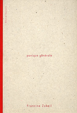 Panique Générale par Francine Zubeil (Marseille, Edition de lObservatoire, 93) est le deuxième dune série de livres dartistes "en aucun lieu", publié en une édition de 500. Ce très beau travail est la répétition dun négatif dun corps de femme voilé, imprimé sur papier calque avec de courtes phrases imprimées en rouge sur quelques unes des pages de droite. Le texte se voit par transparence, montrant divers modèles de panique et danxiété comme indiqués par les mots. Limage ne change jamais, mais elle est imprimée sur les deux côtés de la reliure pour que limage fasse parfois face à son pendant. Les mains semblent nerveuses, les doigts se cherchent mais ne font que se toucher. Il y a une tension dans les coudes pliés et la moue des lèvres. Est-ce une communion ou un mariage ? Y a-t-il vraiment "disparition" lorsque le mot disparition semble disparaître à la fin du livre en très petits caractères ? Quel est le mystère dans ce travail ? Il est là.